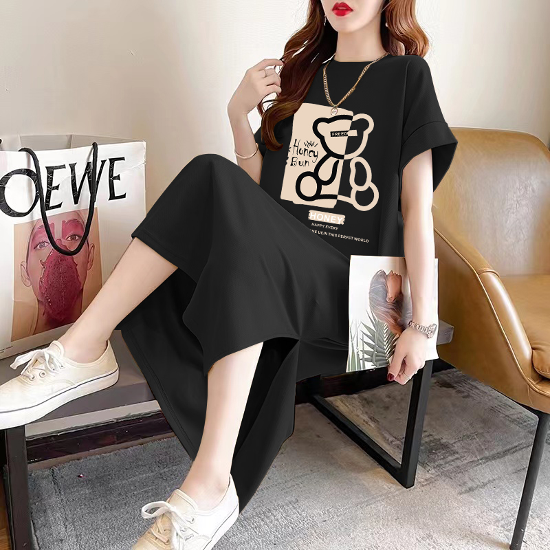 5分鐘前慵懒风短袖t恤裙女夏季休闲宽松过膝长裙纯棉长款连衣裙大码女装 - 黑色套裝